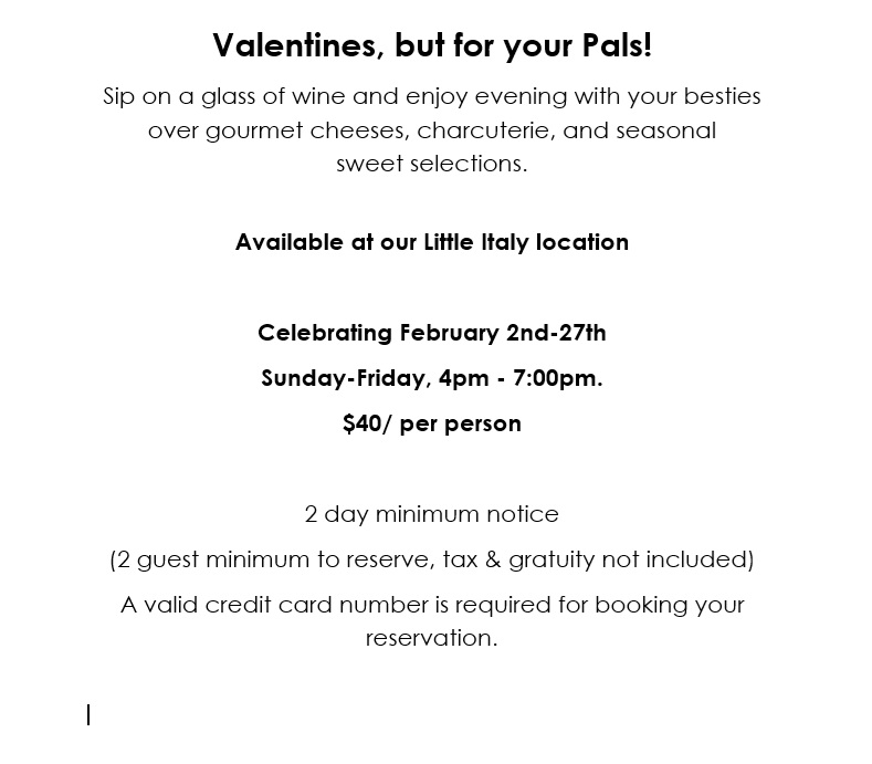 In providing your credit card information to reserve Palentines Cheese& Charcuterie you authorize Extraordinary Desserts Inc. to charge a cancellation fee for the amount of $40 per guest to the credit card provided in the event that the confirmed reservation is not attended or cancelled the day of your reservation. 24 hour notice is required for all reservation cancellations to avoid being charged.